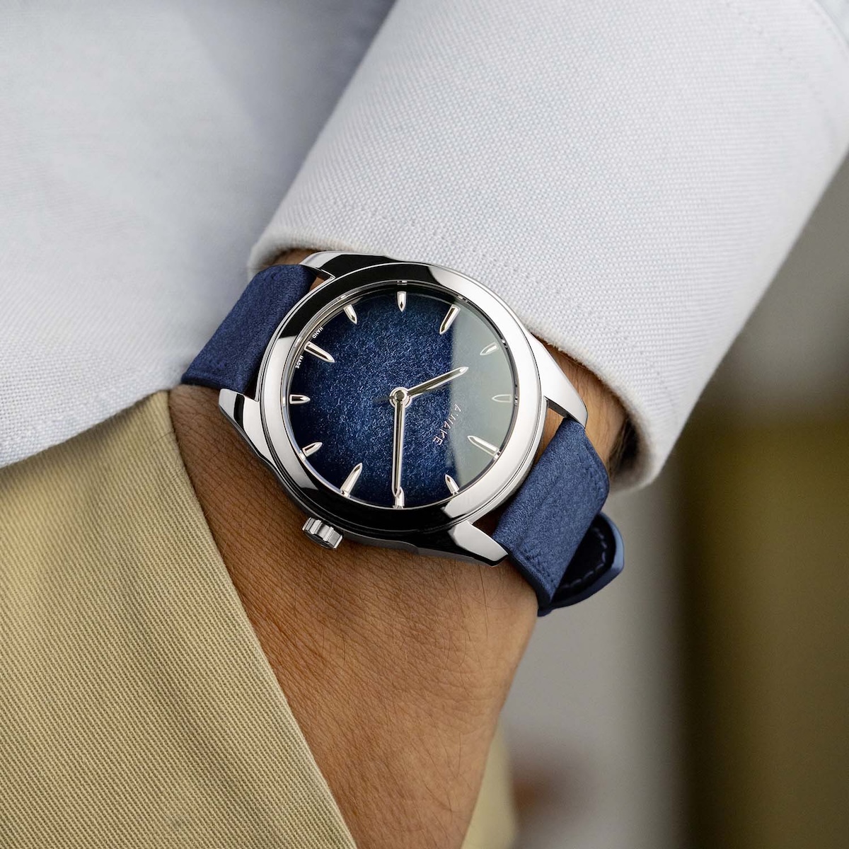 The new models are housed in a 40mm stainless steel case, designed with clean architectural lines that frame the artistry of the dial. The case is paired with a sapphire crystal and an open caseback, ensuring both resilience and a clear view of the automatic movement inside. Powering the watch is the Soprod Newton, a Swiss-made caliber with a 44-hour power reserve and proven reliability. Where these watches truly distinguish themselves is in the dial: silver leaf carefully applied beneath multiple coats of lacquer, a demanding technique that produces depth, reflection, and nuance. Each dial—whether deep Carmine Red, luminous Moonlight Blue, refined Palladium, radiant Ultra Violet, or the limited Golden Hour—shifts its character depending on how light strikes its surface.