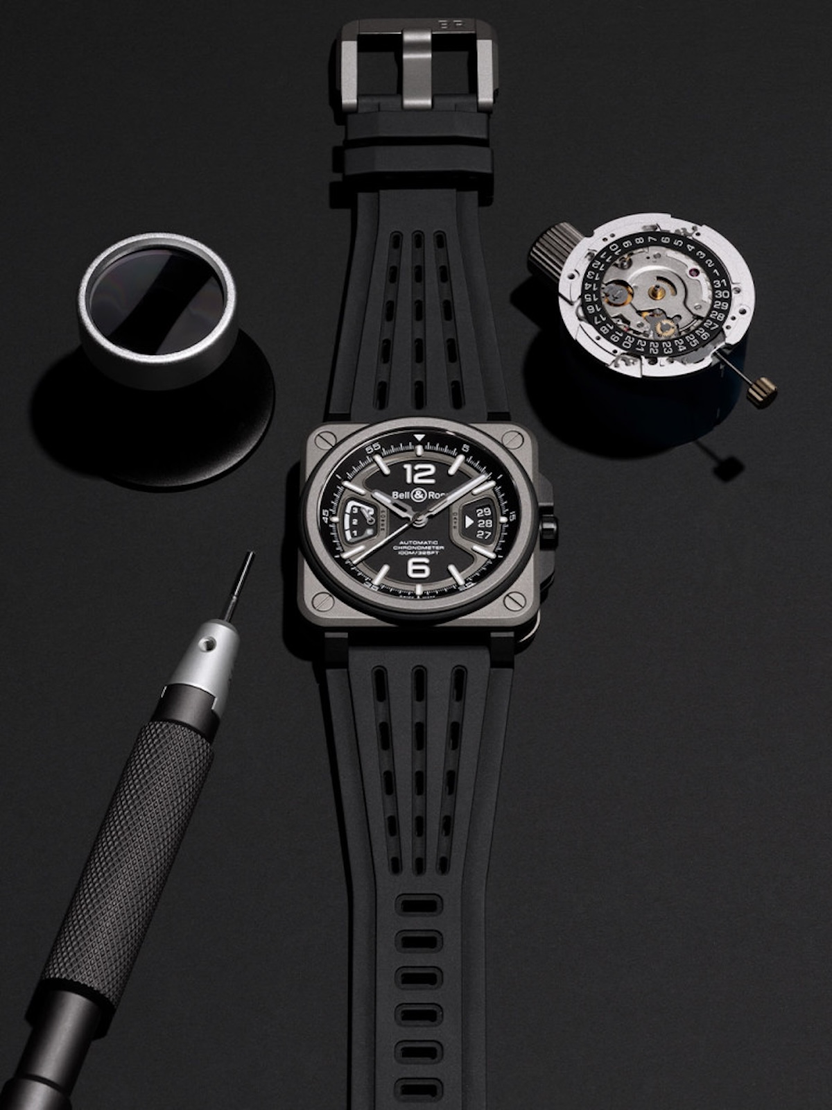 The BR-X3 sits in a 41 mm case, available either in dark grey matte titanium or brushed-and-polished steel. The case architecture is sandwich-style: front and back plates held by visible screws, with the middle section designed for modularity in materials and future variations. Crown guards flank the screw-down crown, and a rubber ring encircles the bezel, giving visual depth while providing a functional buffer.