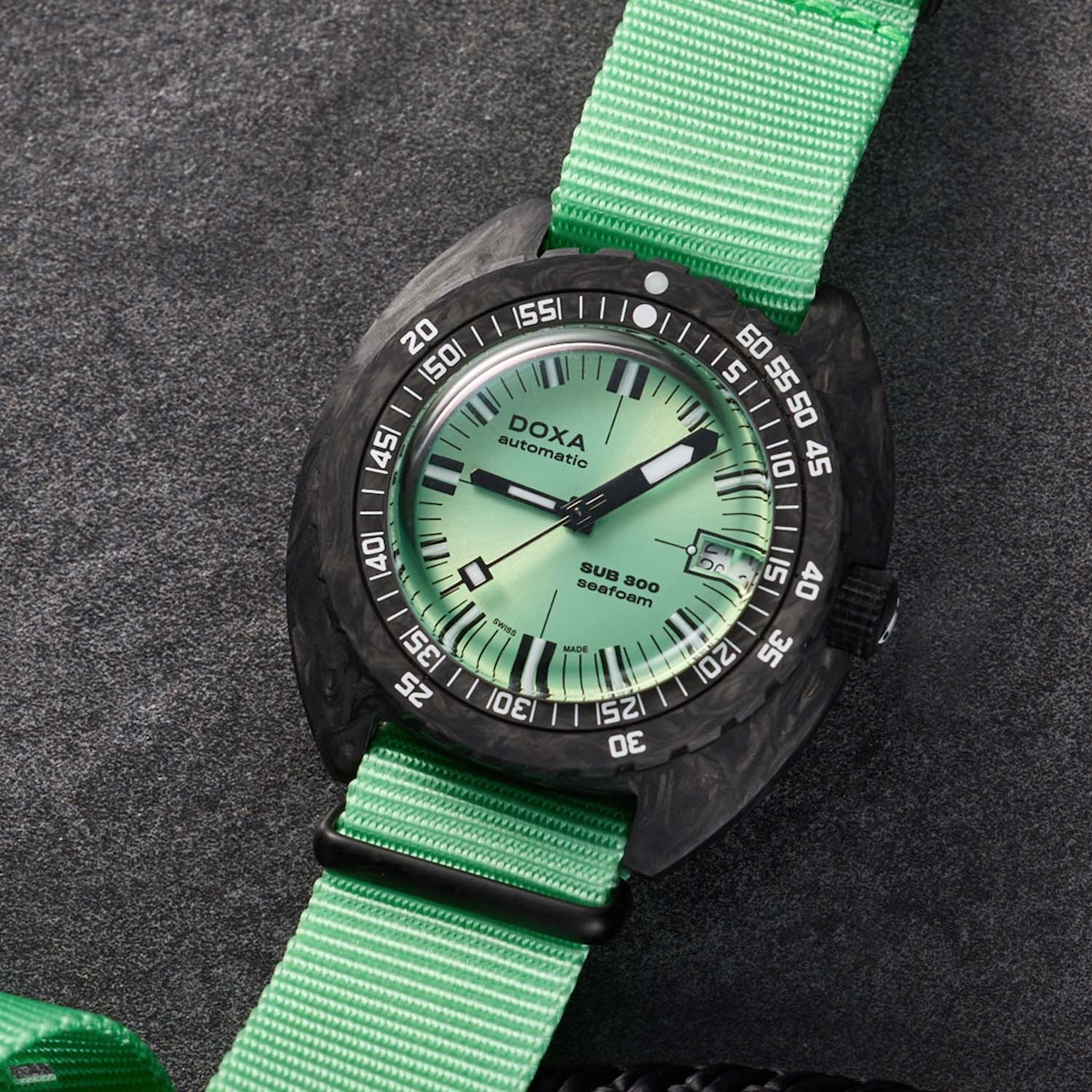 The real talking point is the Seafoam green dial, exclusive to this collaboration. Its pastel tone contrasts vividly against the dark carbon case, making the watch feel youthful, bold, and ready for summer adventures. Large applied indices filled with Super-LumiNova ensure excellent legibility, while the date at three o’clock and orange minute hand give it the distinctive Doxa look.