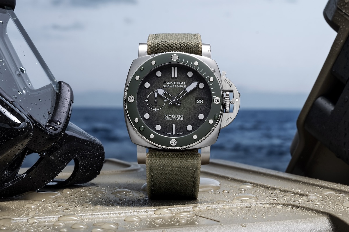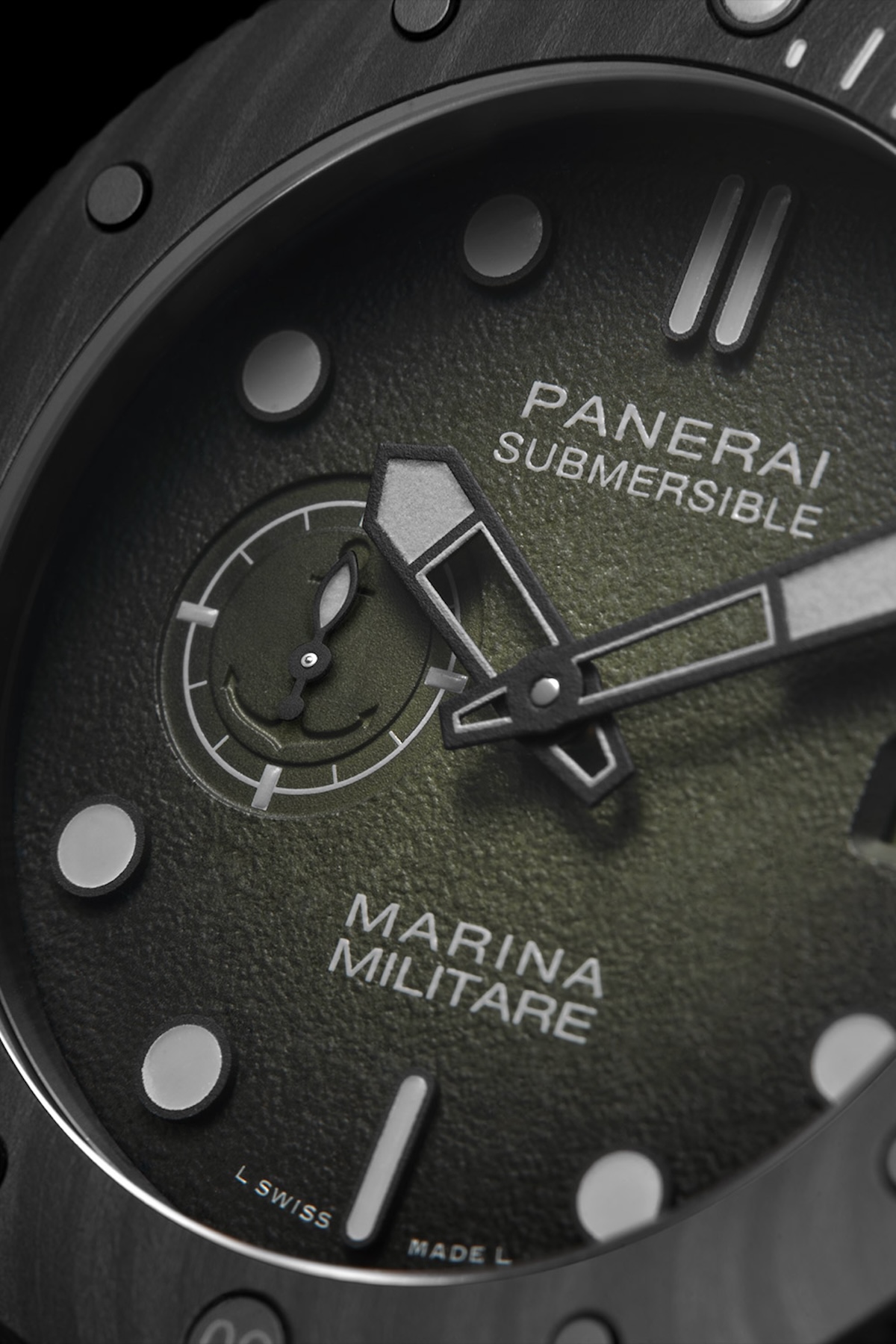 The dial tone is a deep military green fading into black, evoking the flight gear and helmets of naval aviators. Oversized indexes — enlarged by 20% compared to previous Submersibles — are filled with X2-grade grey Super-LumiNova, offering 45% more luminous surface for maximum readability in low light. At 9 o’clock, a small seconds subdial recalls a radar screen, complete with a subtle anchor emblem at its centre, while the Marina Militare wording at 6 o’clock leaves no doubt about the watch’s identity.